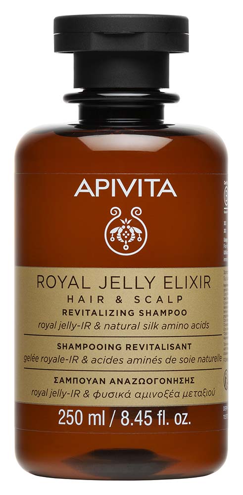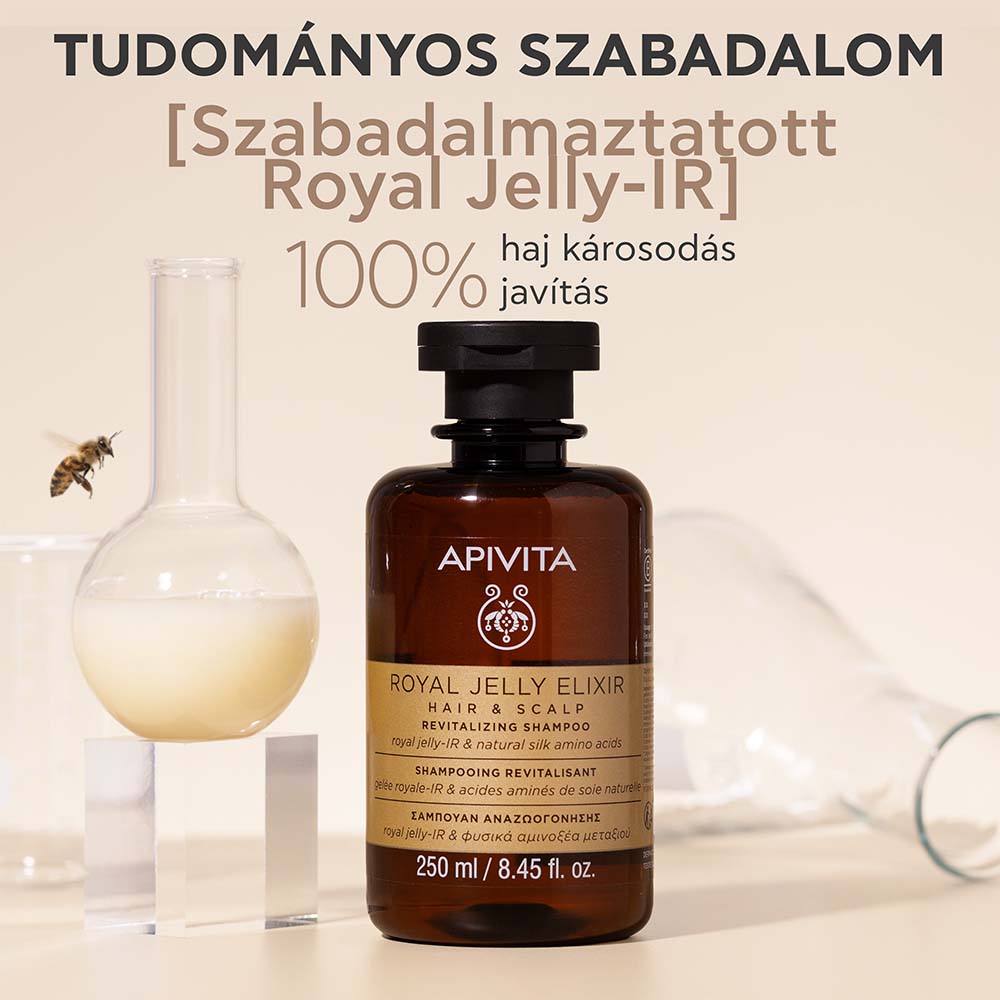 Méhpempő-IR és természetes selyem aminosavak. Revitalizál, megerősít, volument és ragyogást ad. Az APIVITA natúr dermokozmetikai készítményeit bőrgyógyászok és gyógyszerészek közreműködésével, számos kutatási eredmény felhasználásával fejlesztették ki. Hatásuk vizsgálatokkal igazolt. Bőrgyógyászatilag tesztelt. A fejbőr hatszor gyorsabban öregszik, mint az arcbőr, az idő előrehaladtával veszít a hajszálakat tápláló és védő funkciójából, ezért a hajszálak vékonyabbá, gyengébbé, törékenyebbé válhatnak. Ez az APIVITA sampon élénkíti a fejbőr működését, táplálja és megszépíti a hajszálakat, használatával a haj visszakapja természetes szépségét. A szabadalmaztatott méhpempő-IR mélyen penetrál a fejbőrbe, hogy értékes tápanyaggal lássa el azt, valamint kitölti a hajszálak keratinhiány okozta hézagjait és regenerálja a károsodott hajszálakat. Természetes selyem aminosav tartalma bevonja az elvékonyodott hajszálakat, hidratál és volument ad a hajnak. Klinikailag bizonyítottan a haj erősebbé (67%), ragyogóbbá (77%), élettel telibbé (60%) válik.