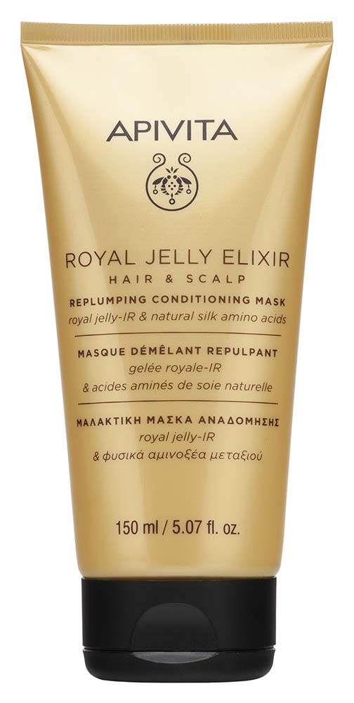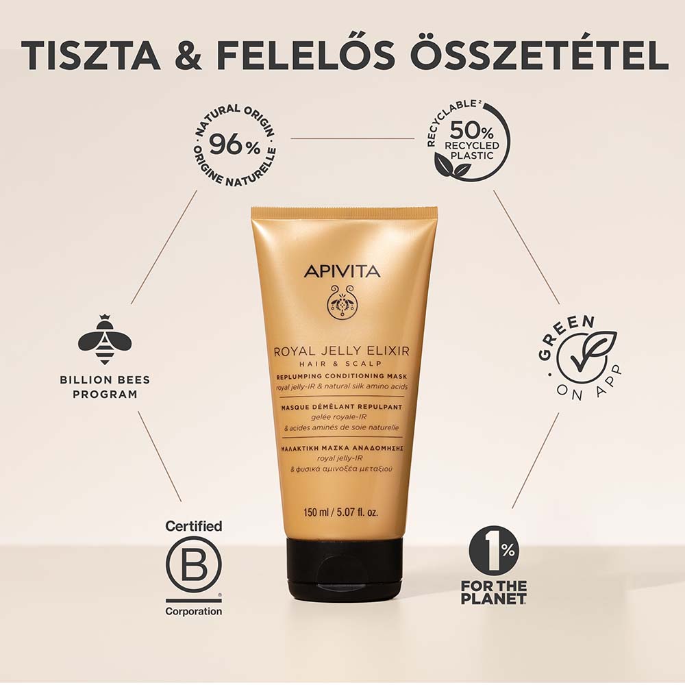 Méhpempő-IR és természetes selyem aminosavak. Revitalizál, megerősít, volument, ragyogást és rugalmasságot ad. Az APIVITA natúr dermokozmetikai készítményeit bőrgyógyászok és gyógyszerészek közreműködésével, számos kutatási eredmény felhasználásával fejlesztették ki. Hatásuk klinikai vizsgálatokkal igazolt. Bőrgyógyászatilag tesztelt. A fejbőr hatszor gyorsabban öregszik, mint az arcbőr, az idő előrehaladtával veszít a hajszálakat tápláló és védő funkciójából, ezért a hajszálak vékonyabbá, gyengébbé, törékenyebbé válnak. Az APIVITA kondicionáló maszkja élénkíti a fejbőr működését, visszatáplálja és megszépíti a hajszálakat, használatával a haj visszakapja természetes szépségét. A szabadalmaztatott méhpempő-IR mélyen penetrál a fejbőrbe, hogy értékes tápanyaggal lássa el azt, valamint kitölti a hajszálak keratinhiány okozta hézagjait, regenerálja a károsodott hajszálakat. A természetes selyem aminosav bevonja az elvékonyodott hajszálakat, hidratál és volument ad a hajnak. Klinikailag bizonyítottan növeli a haj rugalmasságát (+80%), sűrűségét (+66%), selymességét (+135%).