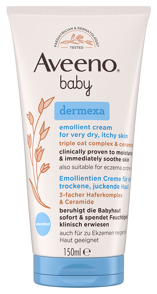 Az Aveeno® baby dermexa® bőrpuhító krém - mely a legmagasabb koncentrációban* tartalmaz zabkivonatot, zabolajat, kolloid zablisztet és ceramidokat -, nyugtatja a bőrt és megerősíti annak természetes védőrétegét.