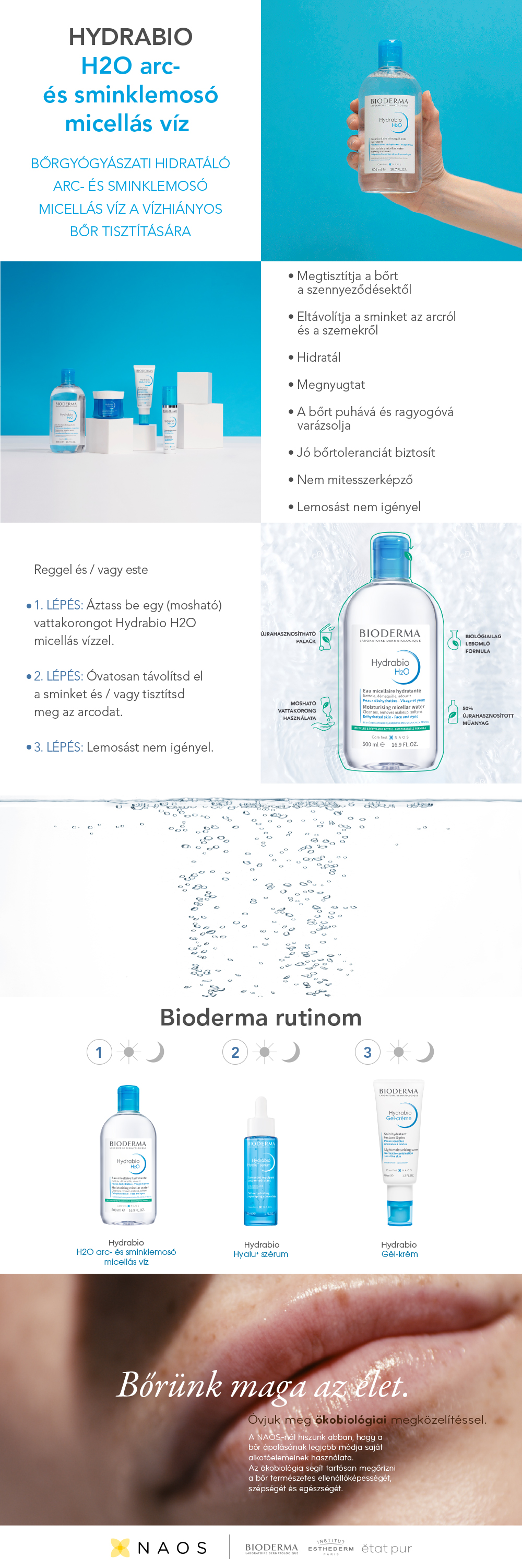 A Hydrabio H20 az első tisztító és hidratáló hatású micellás víz Aquagenium™ szabadalommal. Segít visszaállítani a bőr természetes hidratáltságát és vízmegtartó képességét, ami elengedhetetlen a bőr természetes egyensúlyának megőrzéséhez. Az oldatban lévő micellák egy lépésben távolítják el a sminket és a szennyeződéseket az arcról és a szemekről. Jó bőr- és szemtoleranciát biztosít. Nem mitesszerképző. Bőrgyógyászatilag tesztelt.