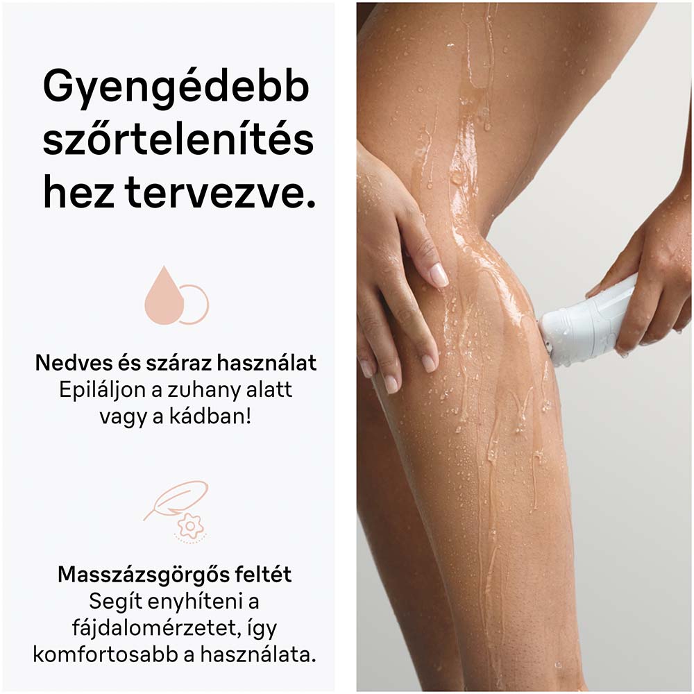 Kíméletes szőrtelenítés: Nedves és száraz használat. Kevesebb fájdalom, nagyobb kényelem a gyengéd, fürdés vagy zuhanyozás közbeni epilálással