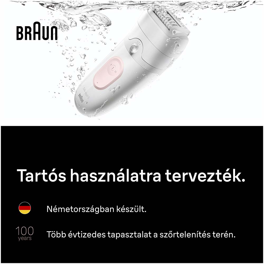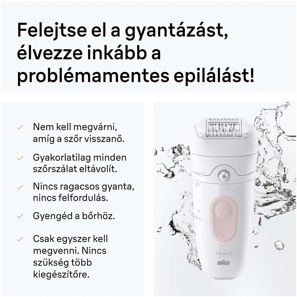 A Braun Silk·épil 5 epilátorral akár egy hónapon át élvezheti a sima bőr élményét, bármikor. A vezeték nélküli Braun epilátor MicroGrip csipesz technológiája még azokat a szőrszálakat is eltávolítja, melyeket a gyanta nem képes (akár a 0,5 mm-es szőrszálakat is). A masszázsgörgős fejnek köszönhetően a kezelés kevésbé fájdalmas. Mondjon búcsút a kényelmetlenségeknek! Nem kell többé megvárnia, míg a szőr visszanő, mint a gyanta vagy más szőrtelenítő termékek esetében. A kényelmes használatra tervezett epilátornak köszönhetően nincs szükség utólagos takarításra vagy időpontfoglalásra a kozmetikusnál. Tipp: a fájdalomérzet csökkentése érdekében végezze az epilálást meleg vízben, fürdés vagy zuhanyozás közben.