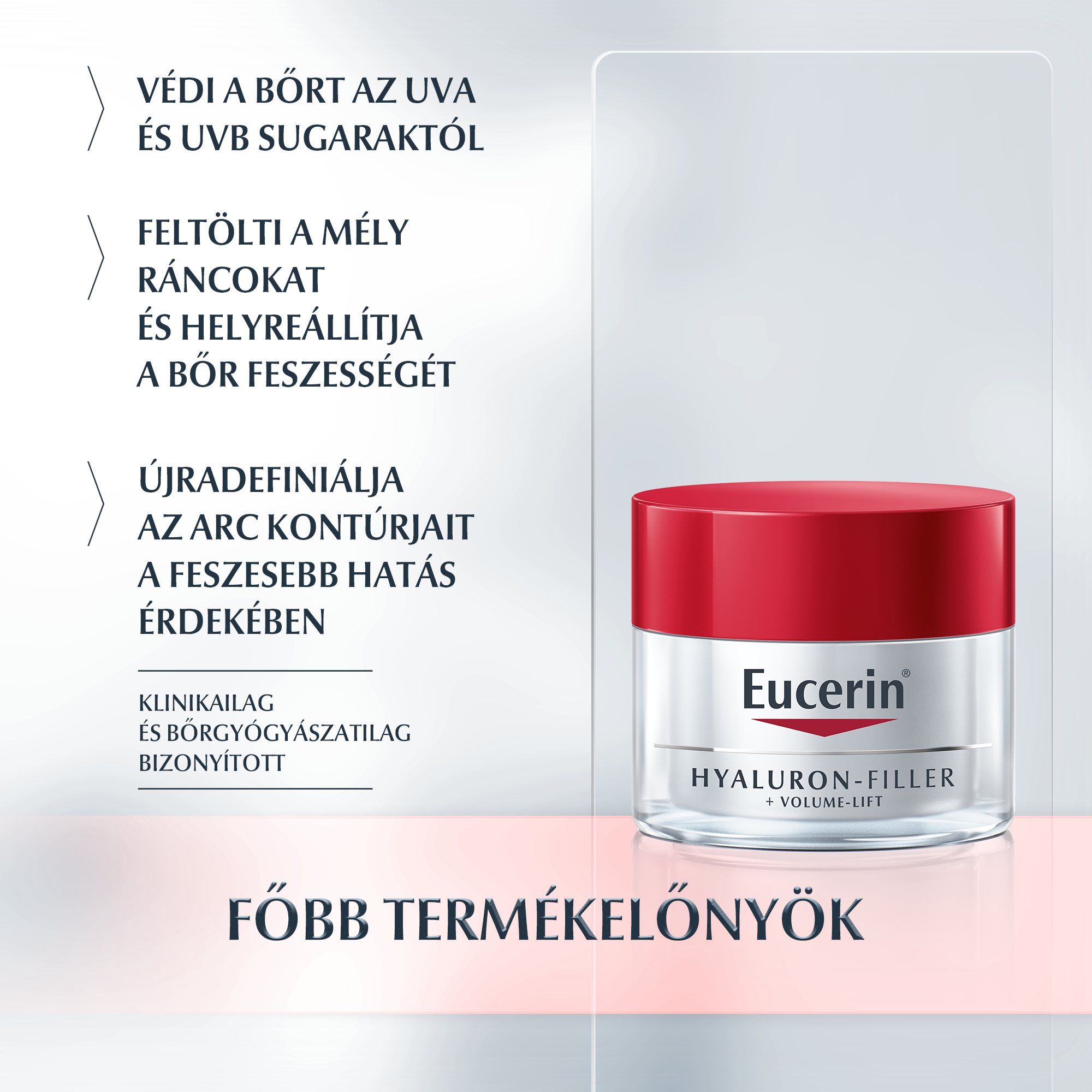 Eucerin® Hyaluron-Filler+Volume-Lift nappali arckrém száraz bőrre: három hatóanyaga a bőr adott rétegeiben fejti ki hatását, hogy segítse a bőr megereszkedését, az elhalványuló arckontúrt és a bőrfeszesség vesztést csökkenteni. A természetes úton kinyert magnolol segít növelni a bőrfeszesítő sejtek méretét és számát. Az ánizsból nyert oligo-peptidek segítenek erősíteni a bőrszövet kötését, illetve javítják a kollagén újratermelődését.* A hialuronsav javítja a nedvességmegkötő képességet annak érdekében, hogy a bőrfelület telt és sima legyen. FF15 + UVA-védelem, mely óvja a bőrt a napsugárzás bőröregítő hatásával szemben.