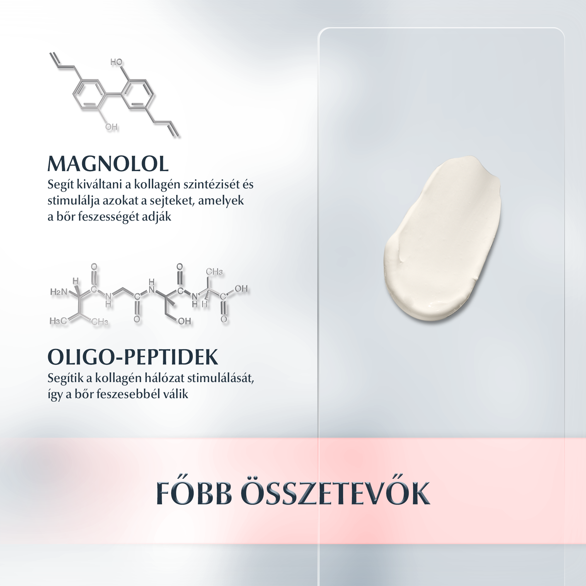 Gazdag állagú bőrfeszesítő nappali arckrém száraz bőrre magnolollal, oligo-peptidekkel és hialuronsavval, mely hatóanyagok kombinációja felveszi a harcot a bőr feszességének csökkenése legfőbb okaival szemben.