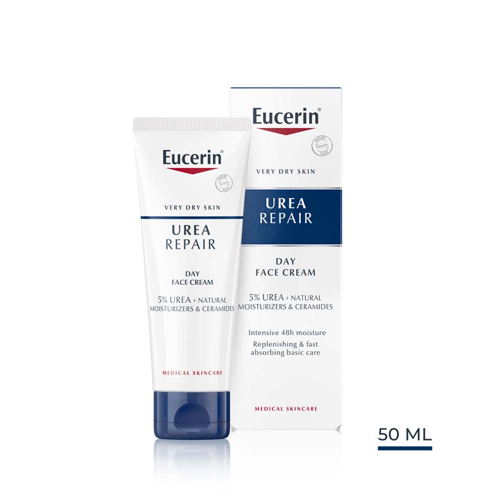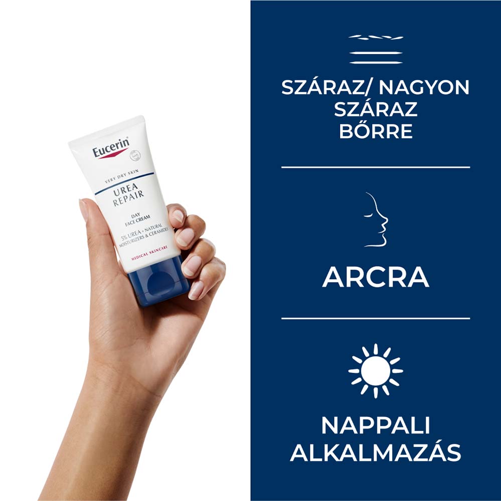 Az Eucerin® 5% Urea nappali arckrém egy könnyű állagú mindennap használható arcápoló száraz, nagyon száraz, feszülő bőrre. Természetes hidratáló faktorokat, ureát és tejsavat tartalmaz, mely hatóanyagok megkötik a nedvességet a bőrben. Az arckrém használata enyhíti a bőr száraz, feszülő érzését, bőre újra puha, jól hidratált és üde lesz. A bőr szárazságát a nedvességvesztés okozza, az Eucerin® 5% Urea nappali arckrém aktív hatóanyagtartalmával visszapótolja a nedvességet a bőrbe. Kitűnő sminkalap, a termék használata férfiak számára is ajánlott borotválkozás után.
