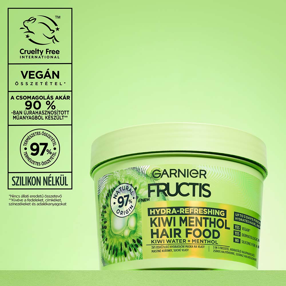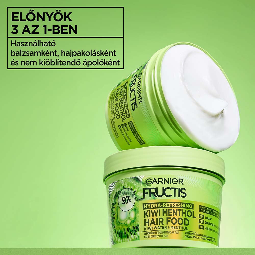 Garnier Fructis 3 az 1-ben frissítő hidratáló hajpakolás kivivel és mentollal. Akár azonnal felfrissítheti a hajat anélkül, hogy elnehezítené azt.