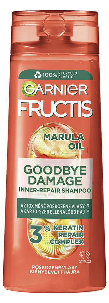 Új Fructis összetételek hajerősítő, aktív gyümölcskoncentrátummal. Gyümölcsökből és növényekből származó kivonatok, B3- és B6-vitamin és citrom protein különleges kombinációja az ápolt hajért. A Goodbye Damage program összetételében a Fructis az amla-olaj kivonatokat keraphyllal társítja a haj felületének megszépítéséért és a külső hatások által okozott rések csökkentéséért.