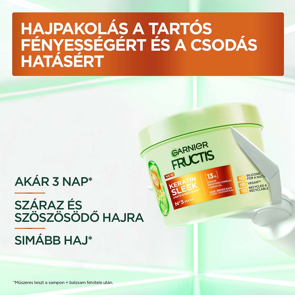 A Garnier Fructis Keratin Sleek hajpakolás sűrű, krémes állagú, könnyen felvihető és jól eloszlatható a hajon. Már néhány használat után érezhetően simább, puhább és fényesebb lesz a haj, a szöszösödés látványosan csökken. A keratin tartalom erősíti a hajszálakat, így a haj kevésbé töredezik és könnyebben kifésülhető. Előnye, hogy intenzíven táplál anélkül, hogy elnehezítené a hajat. Hátránya, hogy zsírosodásra hajlamos haj esetén a hajtöveknél nem ajánlott túl gyakran használni. Ajánlom mindenkinek, aki mélyreható ápolást keres száraz, kezelhetetlen hajára. Az All2test.hu közreműködésével tesztelve