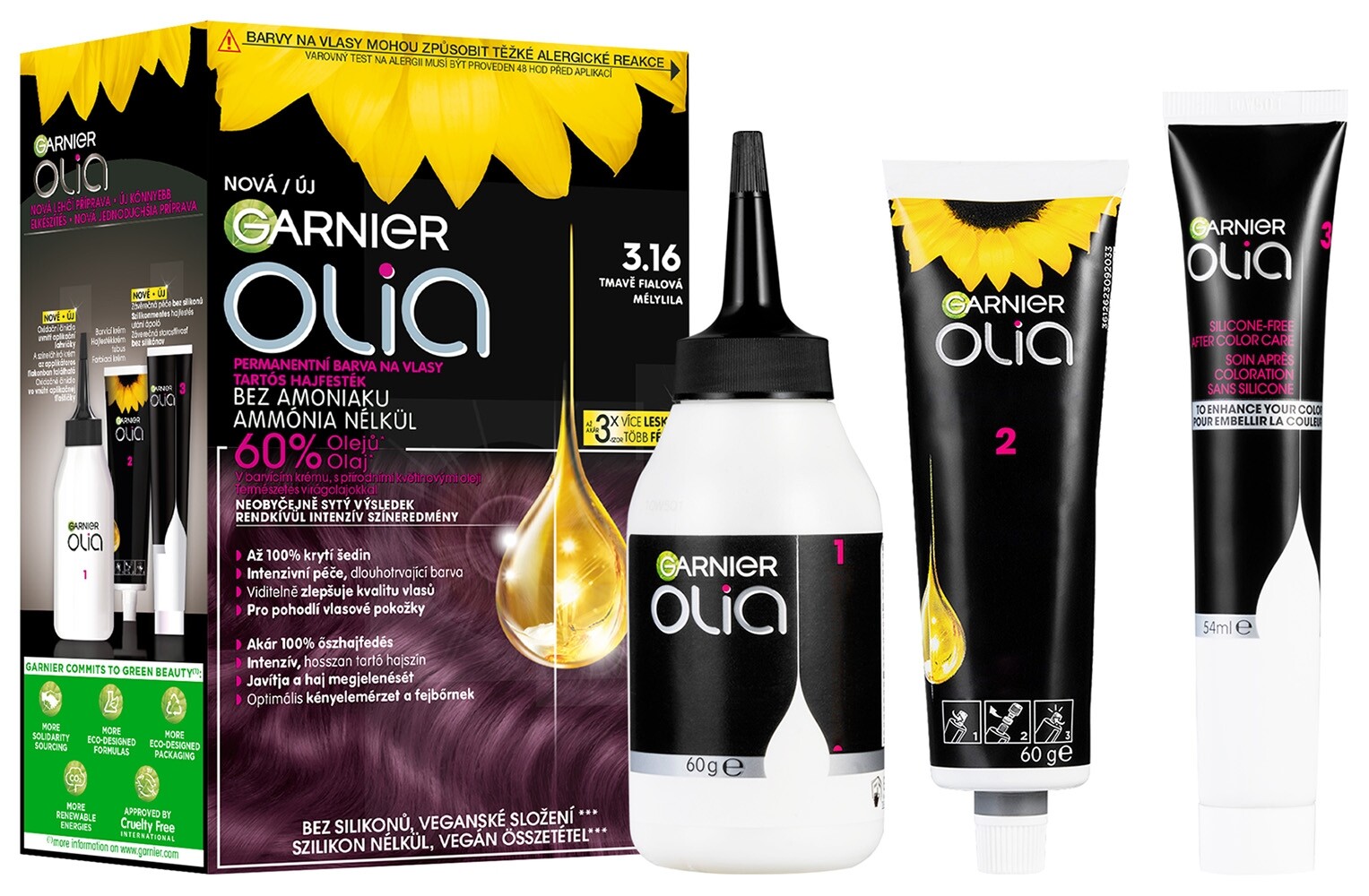 A Garnier Olia egy tartós hajfesték 60%-os olajtartalommal, ammónia és szilikonok nélkül. Olaj alapú bejuttató rendszer a festéket intenzíven a hajrost szívébe juttatja a rendkívül erőteljes színeredményért. A csomagolás immár applikátort is tartalmaz, amely megkönnyíti a felvitelt. Az Olia akár 100%-ban fedi az ősz hajszálakat. Intenzív ápolója láthatóan megszépíti a hajat és komfortérzetet nyújt a fejbőrnek.