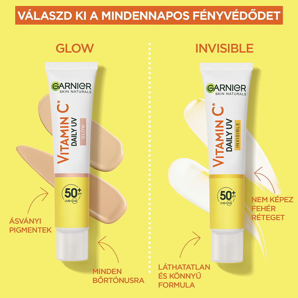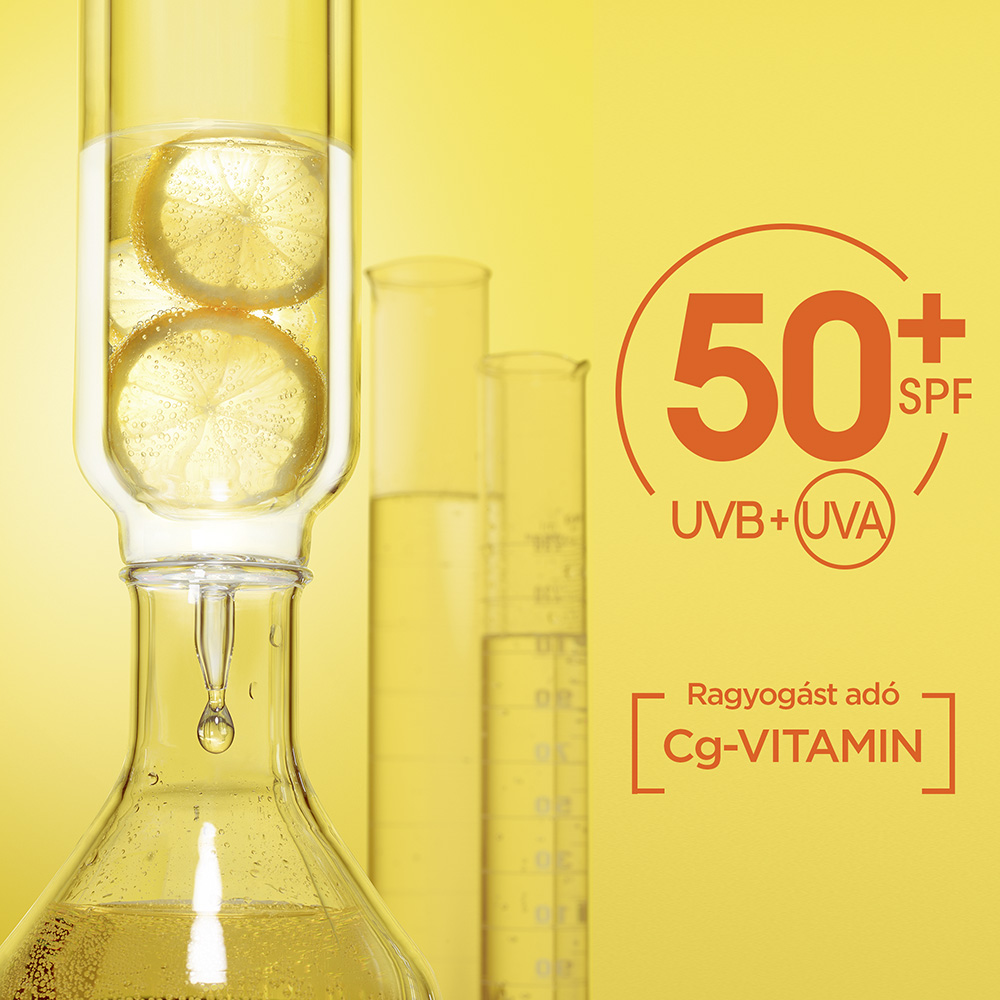 A C-VITAMIN* ragyogást adó ereje SPF50+ NAGYON MAGAS VÉDELMET nyújtó fényvédővel és ÁSVÁNYI PIGMENTEKKEL kombinálva egy könnyű, ragyogást adó, mindennapos fluidban. Azonnal: a bőr védett az UVB-, UVA- és hosszú hullámú UVA-sugárzással szemben a sötét foltok megelőzéséért. Nem hagy fehér réteget, nem zsíros, nem ragad, nem komedogén.
