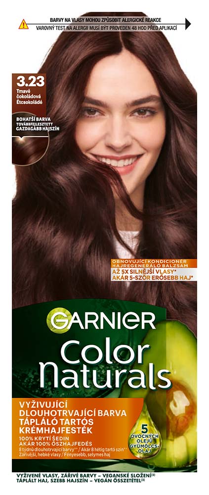 A Garnier Color Naturals Créme a Garnier első tápláló hajfestéke kettős védelemmel. A 3 tápláló, olajos összetevővel - olíva, avokádó és shea vaj - gazdagított ápoló formula intenzíven táplálja a hajat, simítja a hajszál felszínét és védőréteget képez a károsodás megelőzéséért, a haj fényességéért és puhaságáért. A második védelem a gazdagabb és tartósabb hajszínért a krémes összetétel, amely bejut a hajszálba és mély színnel tölti fel. Most gazdagabb, mint valaha. Kényeztesse a haját a 3 olajat tartalmazó utóápolónkkal! A hajszín gazdag és hosszan tart. Color Naturals most 20%-kal több tápláló hajápolóval a selymes és fényesebb hajért.