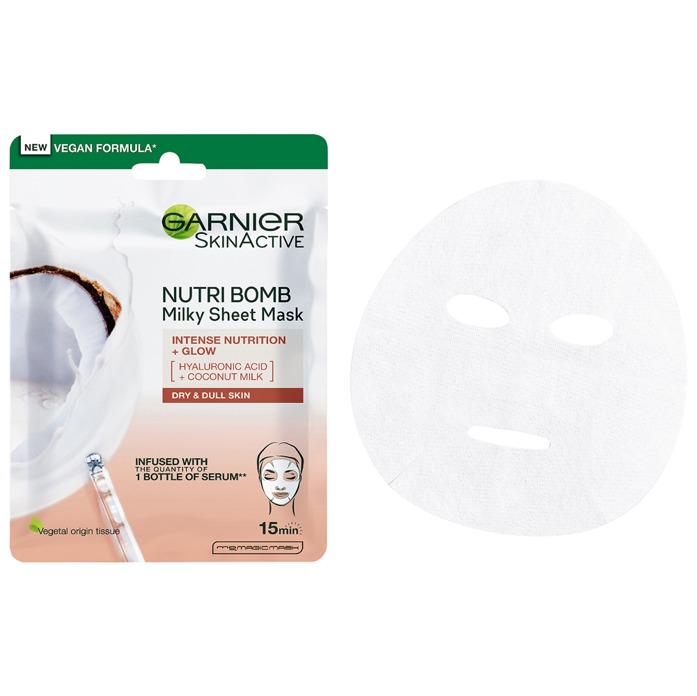Kényeztesd magad a GARNIER elso, tejes szérummal átitatott fátyolmaszkjával a bőröd intenzív táplálásáért és szárazságának csökkentéséért, akár 15 perc alatt! Bio kókusztejjel és feltöltő hatású hialuronsavval gazdagítva. *A Moisture Bomb nappali krém 7 napos alkalmazásával megegyező átlagos glicerinmennyiség.
