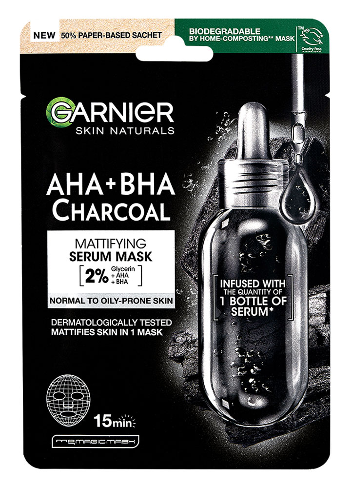 A fekete textil maszk szenet tartalmaz. Feketealga-kivonattal, LHA-val és hialuronsavval gazdagított összetétele segít tisztítani és hidratálni a bőrt a kevésbé látható pórusokért és a bőrfelszín finomításáért, megszépítéséért. Zsíros, tág pórusú bőrre.