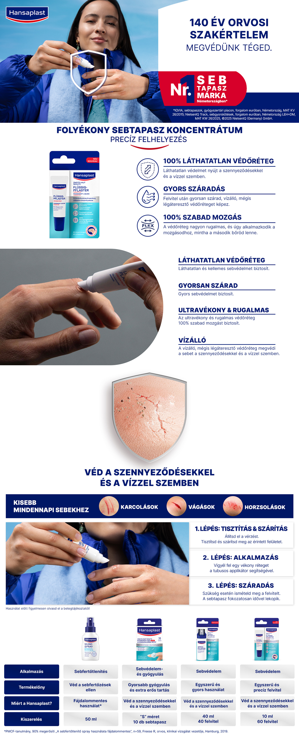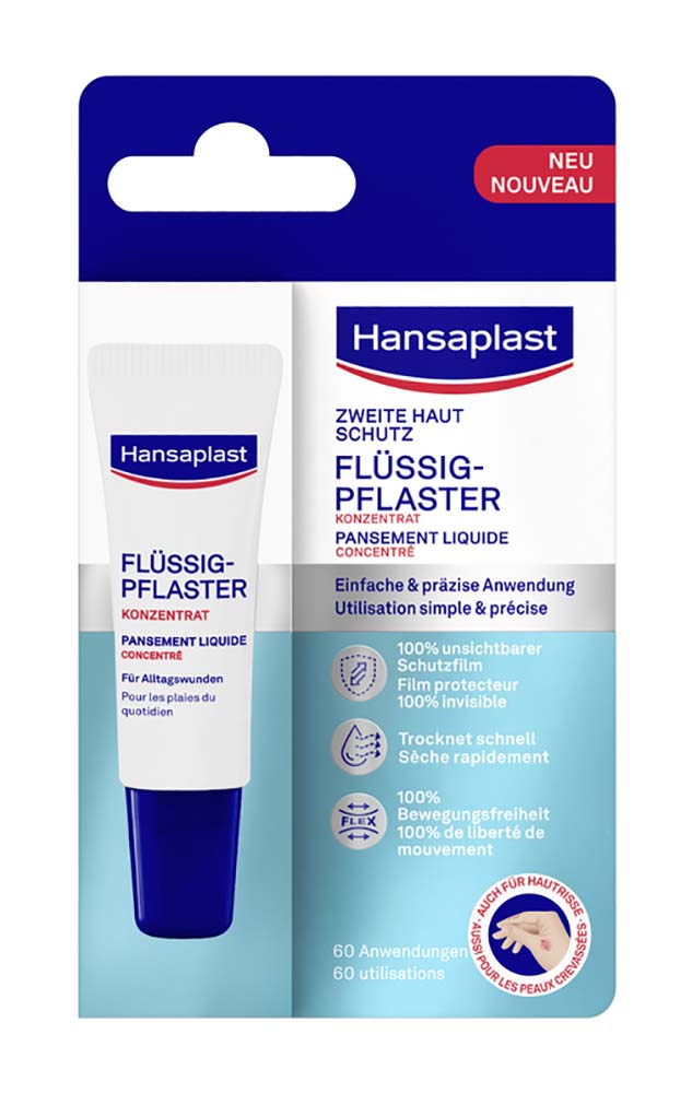 Hansaplast folyékony sebtapasz koncentrátum kisebb, felületi, száraz, mindennapos sérülések, például karcolások, vágások és horzsolások precíz fedésére és védelmére. A termék felvitelkor gyorsan megszárad, és láthatatlan, rugalmas, vékony és vízálló filmréteget képez, amely befedi és védi a sebet.