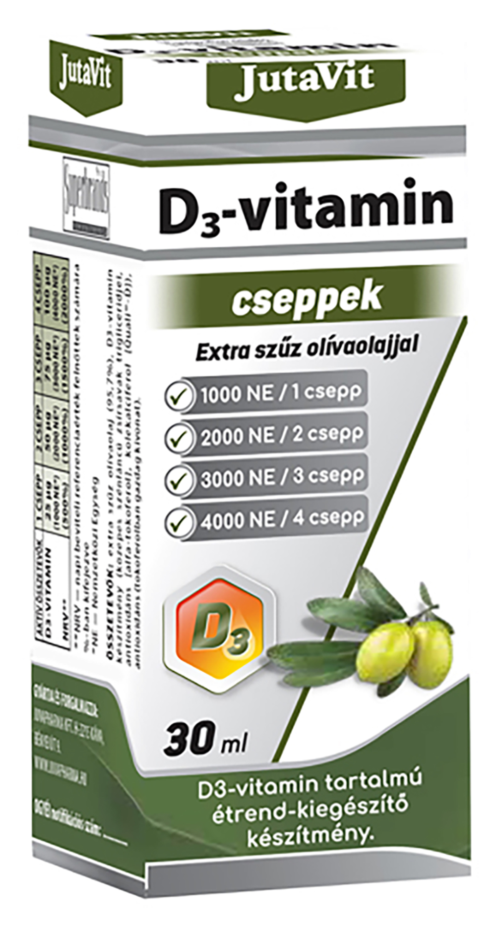 A D-vitamin a zsírban oldódó vitaminok családjába tartozik. A JutaVit D3-vitamin cseppek a D-vitamint extra szűz olívaolajban oldott formában tartalmazza. A D-vitamin hozzájárul a kalcium és a foszfor normál felszívódásához / hasznosulásához, a vér normál kalciumszintjének fenntartásához, az egészséges csontozat és az egészséges izomfunkció fenntartásához. Hozzájárul a normál fogazat fenntartásához és az immunrendszer normál működéséhez. A D-vitamin szerepet játszik a sejtosztódásban.