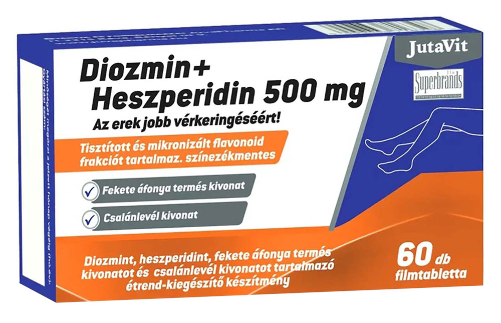 JutaVit Diozmin+Heszperidin 500mg, olyan készítmény, amely diozmint, heszperidint, csalánlevél kivonatot és fekete áfonya kivonatot tartalmaz.