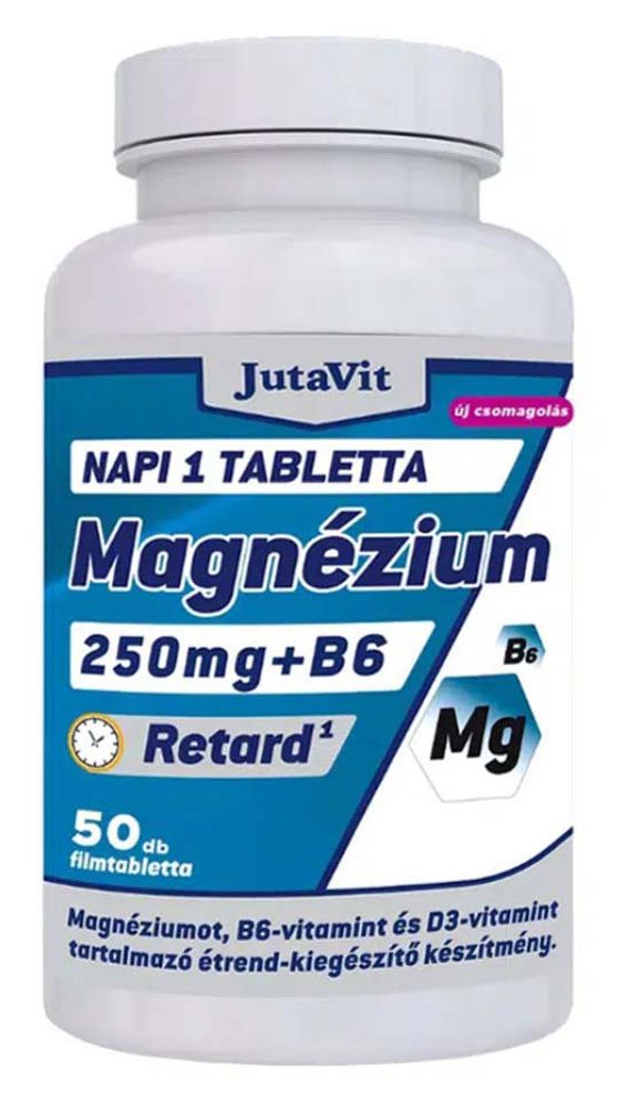 A retard JutaVit Magnézium + B6 + D3 fokozatosan adagolja szervezetünk számára a magnéziumot. A magnézium és a B6 vitamin hozzájárul az idegrendszer megfelelő működéséhez, a normál pszichológiai funkciók fenntartásához, a fáradtság és a kifáradás csökkentéséhez.