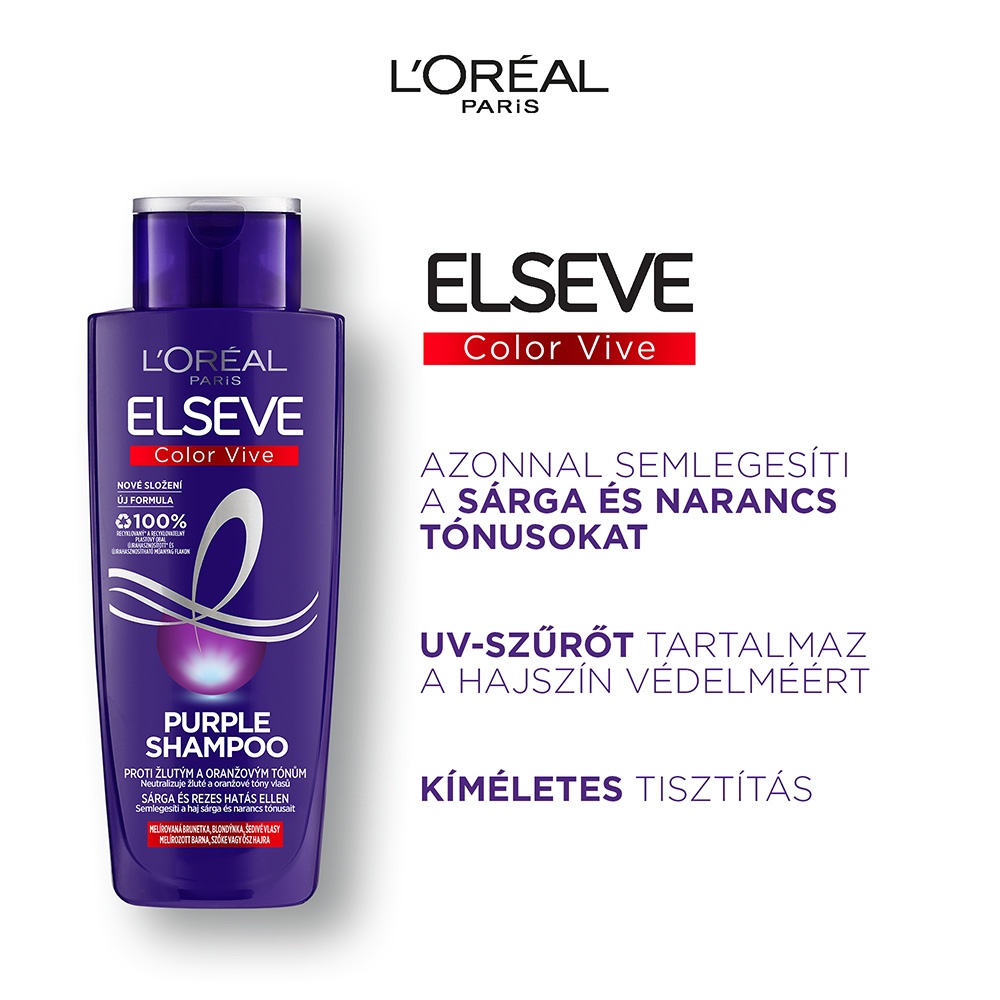 ELSEVE PURPLE sampon a Color -Vive termékcsalád tagja, melírozott barna, szőke vagy ősz haj kíméletes mosásáért, sárga hatás nélkül. Lila színezékkel gazdagított formulánk semlegesíti a haj sárga és narancs tónusait. UV-szűrővel gazdagítva.