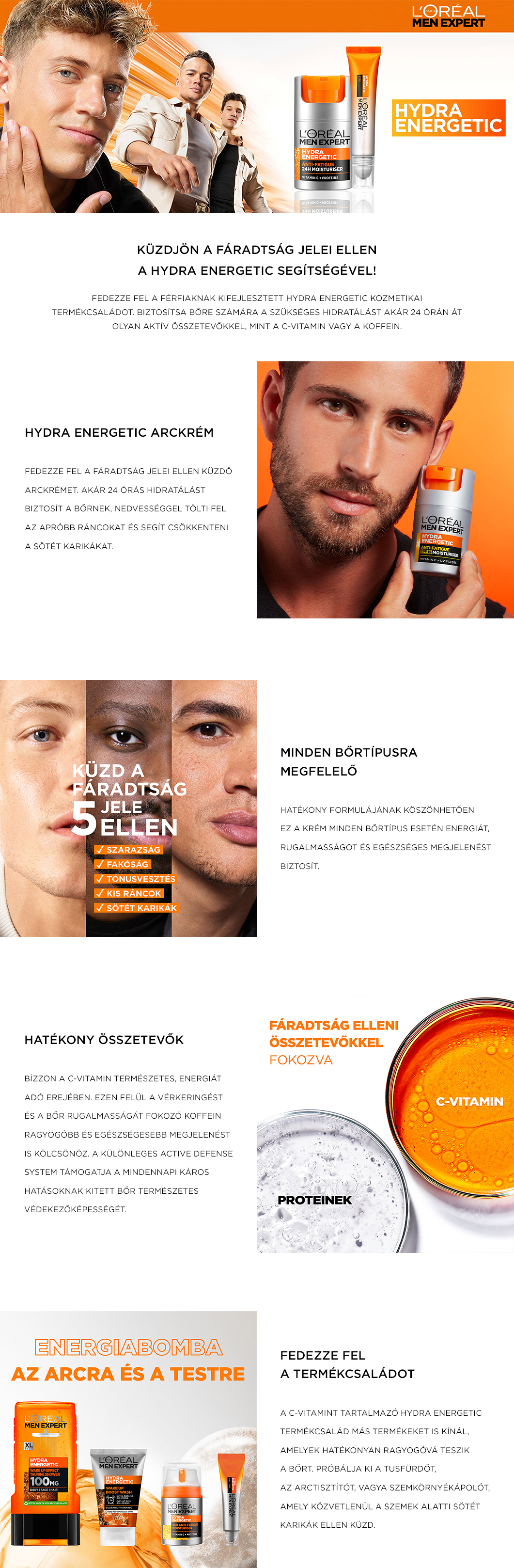 L'Oréal Paris Men Expert Hydra Energetic golyós szemkörnyékápoló krém férfiaknak. C-vitaminnal és koffeinnel gazdagított szemkörnyékápoló krém. A C-vitamin jól ismert energetizáló tulajdonságairól, segít felfrissíteni a szemkörnyéket, erős ragyogást adó hatást biztosít?. A koffein serkentő és antioxidáns hatásairól ismert. Hozzájárul a fáradtság jeleinek, például a sötét karikáknak a csökkentéséhez.