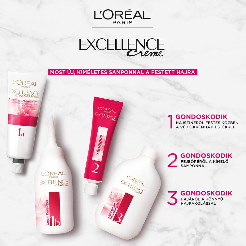 A L'Oréal Paris bemutatja a legendás Excellence hajfesték megújított kollekcióját hármas védelemmel, a még gazdagabb árnyalatokért. Hármas ápolási rituálé, amely gyönyörűvé teszi a hajszínt, ápolja a fejbőrt és a hajat. Új utóápoló sampon kíméletes pH-val, amely felfedi a ragyogást, simítja a hajat és természetes színeredményt nyújt. Akár 100%-os őszhaj-fedés.