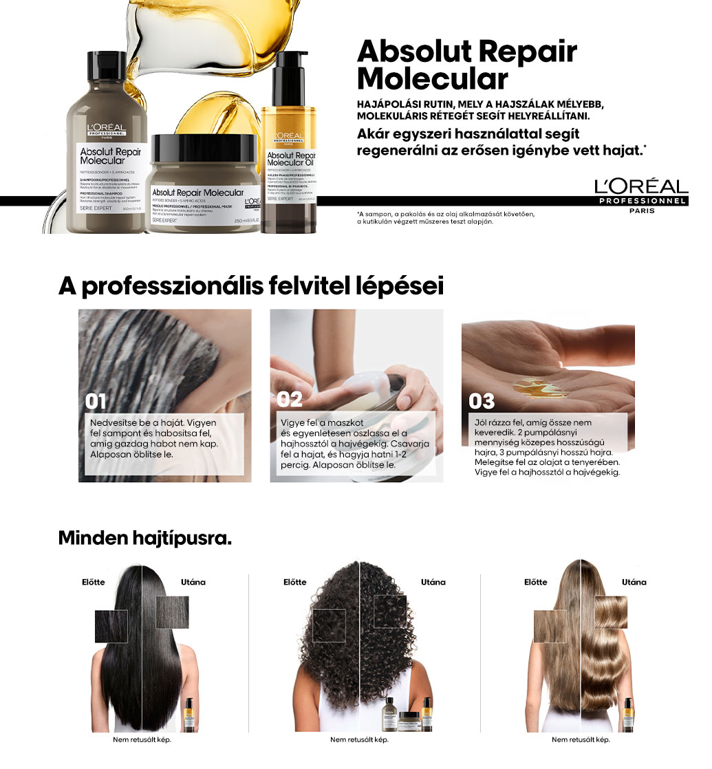 Amikor a haj károsodott, molekuláris szerkezete, mely peptidekből áll, sérül. A legtöbb peptid azonban túl nagy ahhoz, hogy újra bejusson a hajszálba, így a károsodás szinte visszafordíthatatlan. Ebben segít Absolut Repair Molecular kétfázisú olaj, amely segít regenerálni az erősen igénybe vett hajat.*