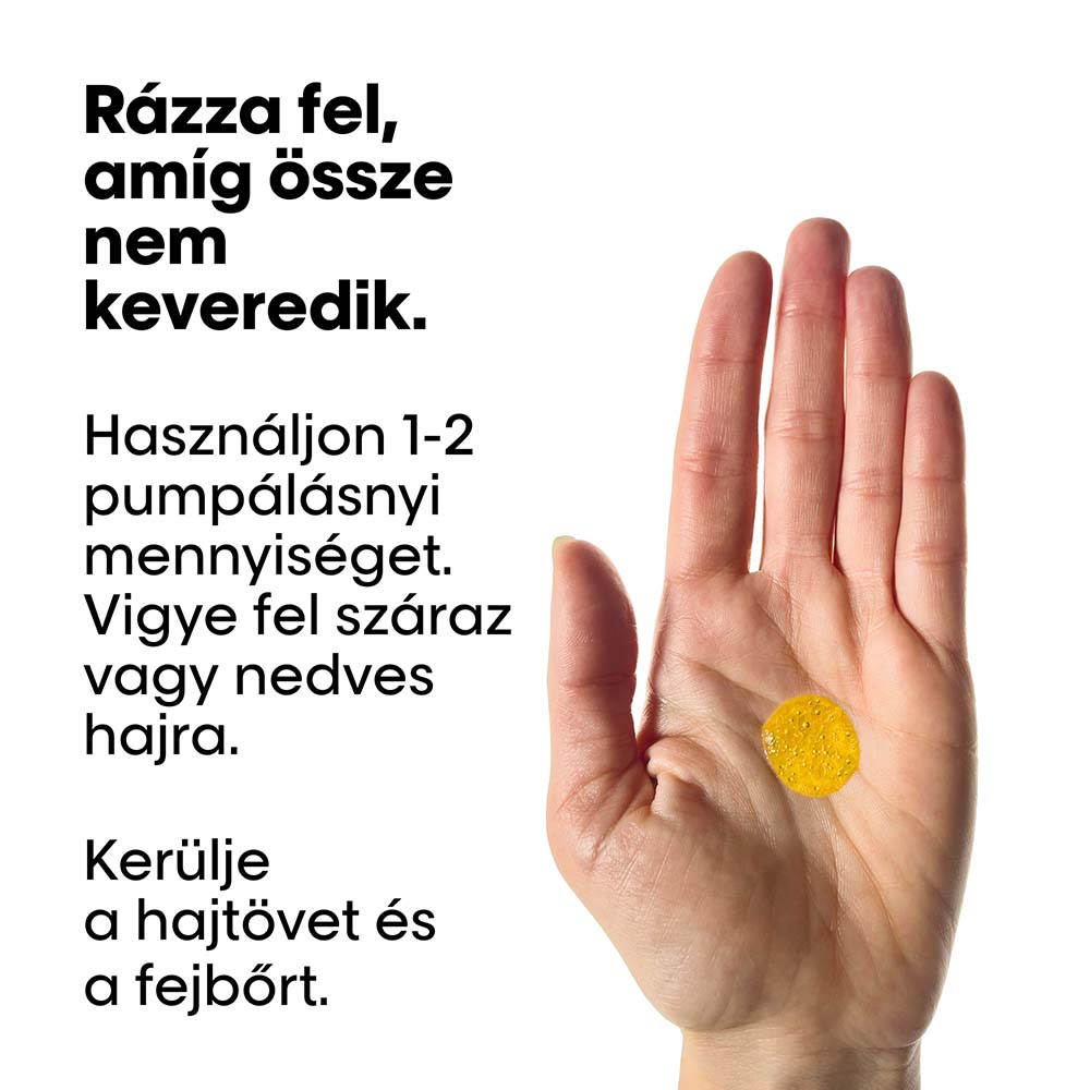 Alaposan rázza össze, amíg a folyadékok teljesen össze nem keverednek. Apró cseppekből álló keveréknek kell képződnie. Nyomjon 1-2 adagot a tenyerébe, és dörzsölje össze a kezeit a technológia aktiválásához. Vigye fel nedves vagy vizes hajra. Kerülje a hajtövet és a fejbőrt.