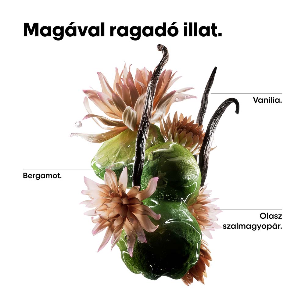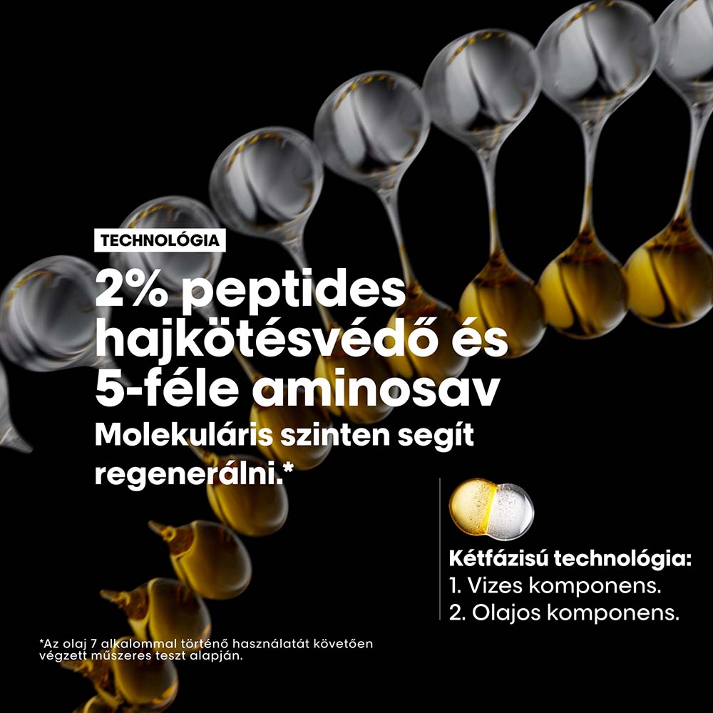 Kétfázisú olaj 1% Peptides hajkötésvédővel + 5-féle aminosavval, amely segít regenerálni az erősen igénybe vett hajat*, akár 100 órán át tartó ragyogást** és akár 3 napon át tartó szöszösödésgátló hatást*** biztosít, valamint nem nehezíti el a hajat.****