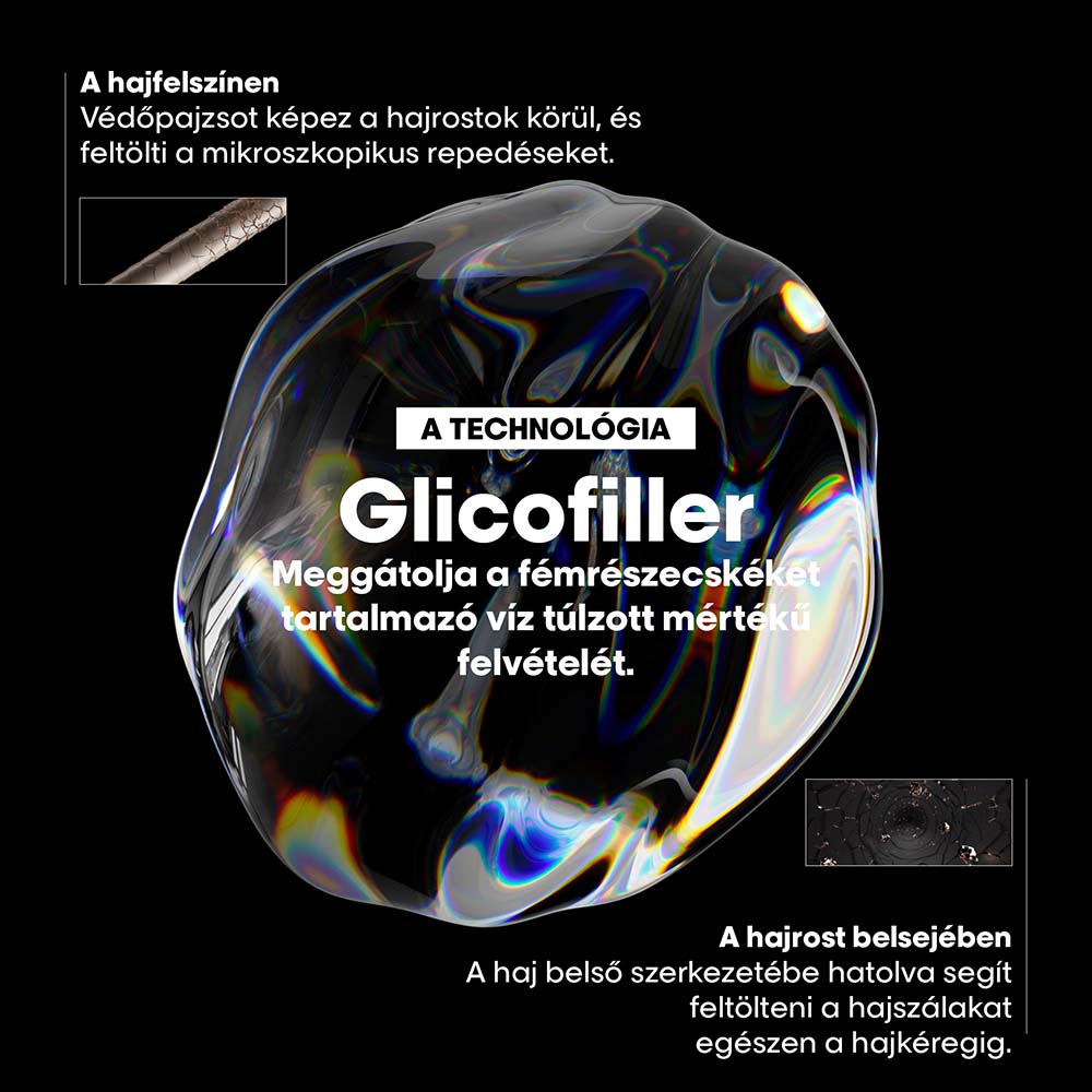 A porozitás elleni¹ technológia még azelőtt kezeli a hajat mielőtt a víznek leginkább ki lenne téve: a hajmosás előtt. 2% koncentrált Glicofiller hatóanyaggal gazdagított, amely egyszerre fejti ki hatását a hajfelszínen és a hajkéregben, meggátolva a fémrészecskéket tartalmazó víz túlzott mértékű felvételét: