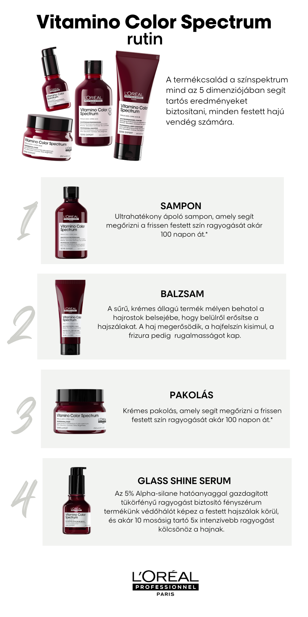 Két héttel a szalonlátogatást követően javasolt, a Vitamino Color Spectrum termékcsalád pigmenteket nem tartalmazó. Vigye fel egyenletesen nedves hajra. Habosítsa fel. A hatóidő az adott árnyalattól és az elérni kívánt semlegesítés mértékétől függ (5–15 perc). Ellenőrizze, hogy minden árnyalatot sikerült-e semlegesíteni. Alaposan öblítse mindaddig, amíg az öblítővízben már nem maradnak festékanyagok. Folytassa a haj ápolását a Vitamino Color Spectrum mélyápoló balzsammal vagy pakolással és a tükörfényű ragyogást biztosító, hajban maradó fényszérummal. Amennyiben a termék a szembe jut, azonnal öblítse ki bő vízzel.
