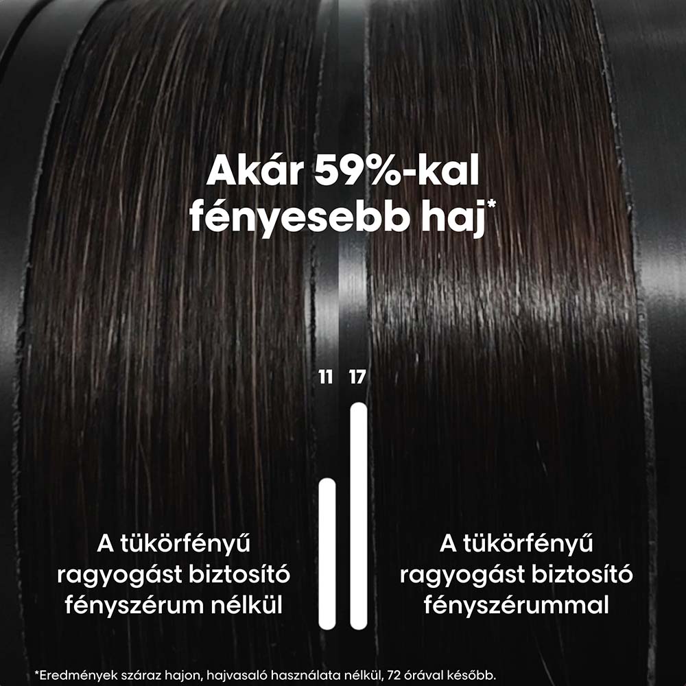 *A szöszösödésgátló hatás, a hővédelem, a hidratáltság, a tápláltság, a sima hajfelszín és a selymes tapintás akár 10 mosásig tart, a tükörfényű ragyogást biztosító fényszérum alkalmazását és 10 normál hajmosást követően végzett műszeres teszt alapján.