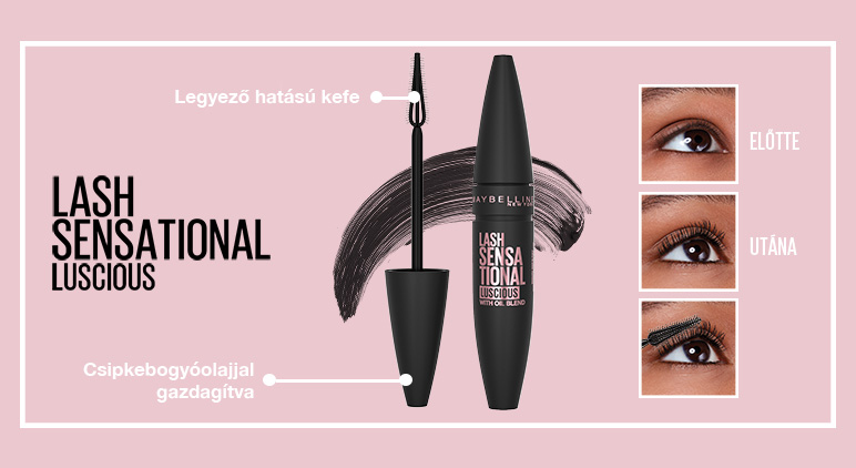 Megújult Lash Sensational luscious szempillaspirál a Maybelline NY-tól! Új csomagolásban, csipkebogyóolajjal és ásványi pigmentekkel gazdagítva. Legyező hatású kefe, amely precíz fedést biztosít a nehezen elérhető pillák számára is.