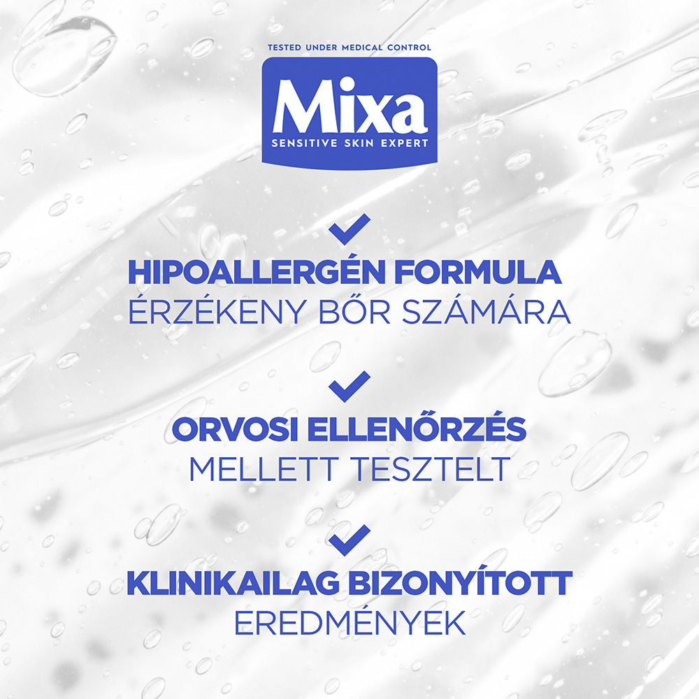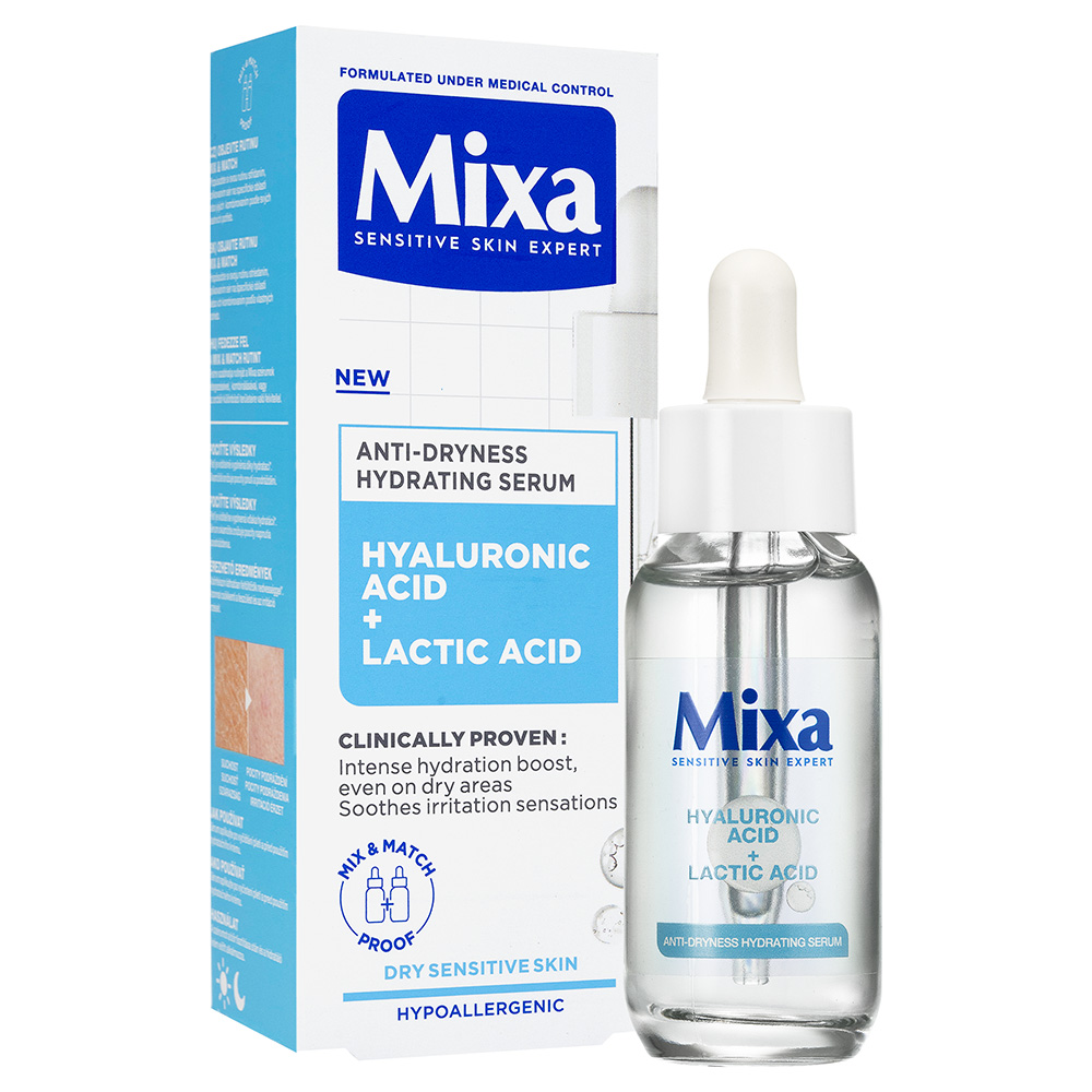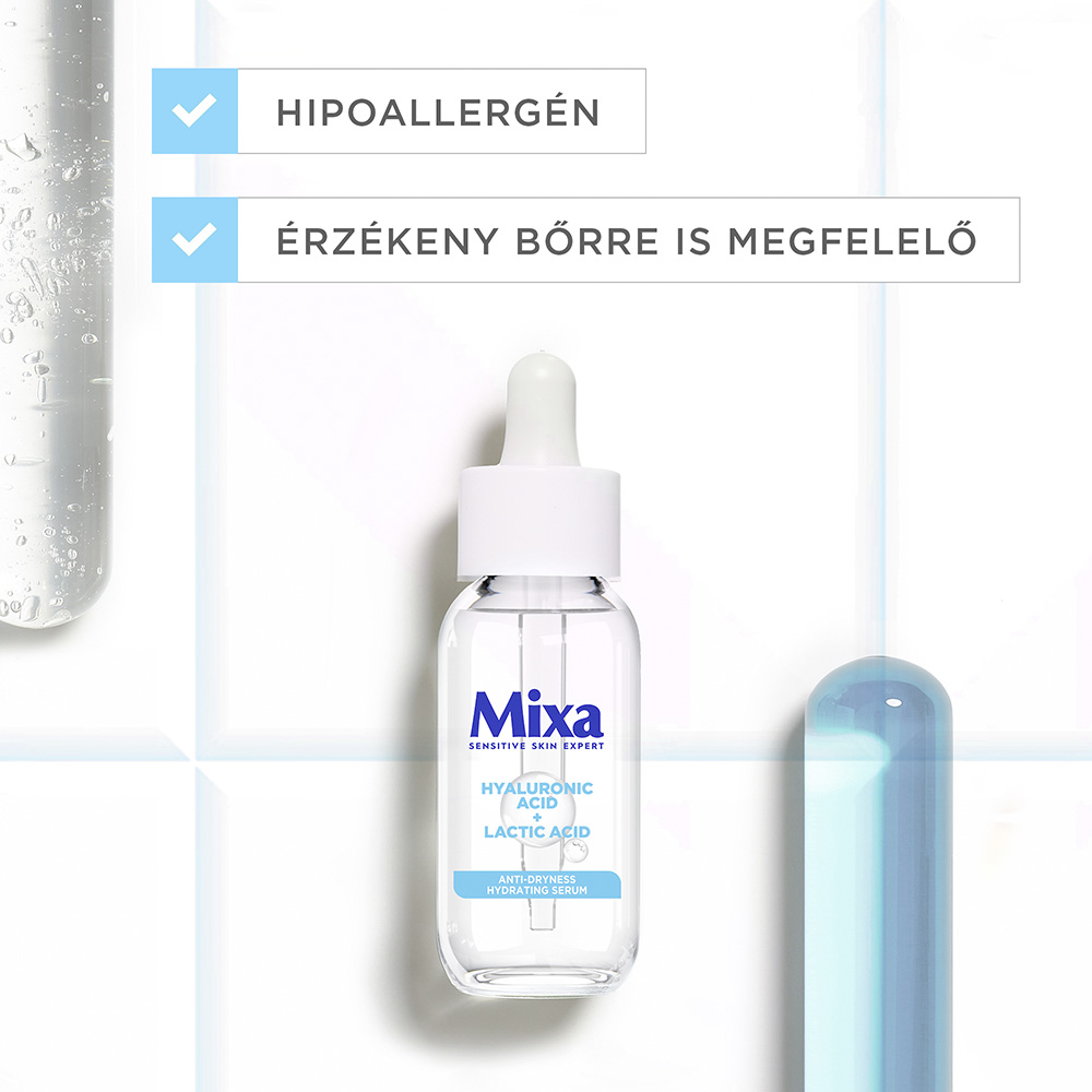 Mixa kiszáradás elleni hidratáló szérum a bőr hidratálásáért és a feszülő és irritáló érzet csökkentésére alkalmas. Mixa kiszáradás elleni hidratáló szérum egymást kiegészítő aktív összetevőkkel gazdagítva: hialuronsav és tejsav. A hialuronsav azonnali hidratáló és a bőrt nedvességgel feltöltő hatásáról ismert. A tejsav a bőrnyugtató formulában segít simítani a bőrt, és hozzájárul az erősebb bőrbarrierhez. Az eredmény: a hidratált bőrfelszín láthatóan feltöltődik nedvességgel, a feszülő és irritáló érzet azonnal csökken. Az All2test.hu közreműködésével tesztelve