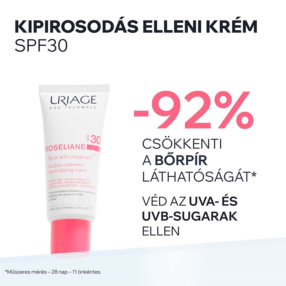 A legújabb kutatási eredmények felhasználásával a rosacea átfogó kezelése érdekében. Uriage termálvízben gazdag textúrája, a Ginzeng, Vörös hínár kivonatokat, és az Uriage Laboratórium által szabadalmaztatott Cerasterol-2F, TLR2-Regul és SK5R komplexeket tartalmazó exkluzív összetétele megelőzi, csökkenti a bőrpírt és akadályozza annak visszatérését, erősíti a bőr barriert, hogy az hatékonyabban védjen a bőrpírt okozó külső hatásokkal szemben, hosszan tartóan nyugtatja az érzékeny bőrt, védi az érfalakat, javítja a mikrokeringést, szabályozza a bőrpír és hajszálértágulatok kialakulásáért is felelős molekuláris reakciókat, enyhíti a forróság és diszkomfort érzetet, hidratálja a bőrt és véd az UVA/UVB sugárzás bőrpírt okozó hatásától. Bőrbe olvadó, nem olajos összetétele a bőrt puhává és alaposan hidratálttá teszi és kiváló sminkalapot biztosít. Magasan tolerált, nem komedogén, hipoallergén.