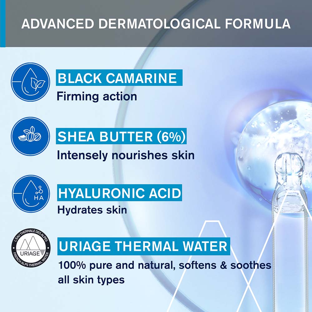 Gazdag textúrájú testápoló balzsam, mely puhává és bársonyossá varázsolja bőrét. Aktív összetevők egyedülálló kombinációjával (Uriage termálvíz, Hyaluronsav, Shea vaj, Fekete varjúbogyó kivonat) védi a kollagén- és elasztikus rostokat, fokozza a bőr feszességét, rugalmasságát, helyreállítja a bőr hidrolipid rétegét, hosszan hidratálja, intenzíven táplálja, nyugtatja és védi bőrét.