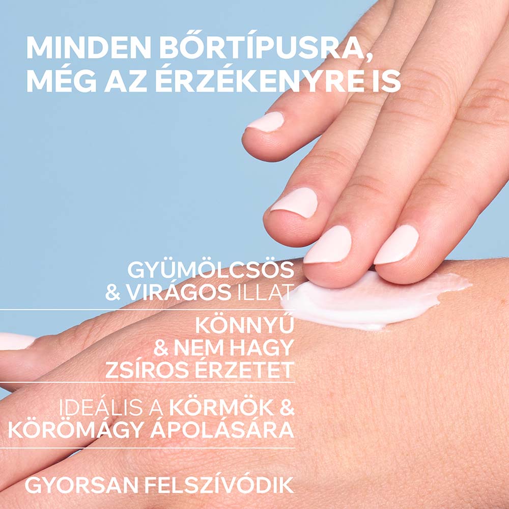 Kirepedezett, irritált, vörösödő kezekre is ajánlott. A száraz megviselt bőrt puhává, kellemes illatúvá, ellenállóbbá és védettebbé teszi a káros külső hatásokkal szemben. Azonnal felszívódik, nem olajos, nem ragad.