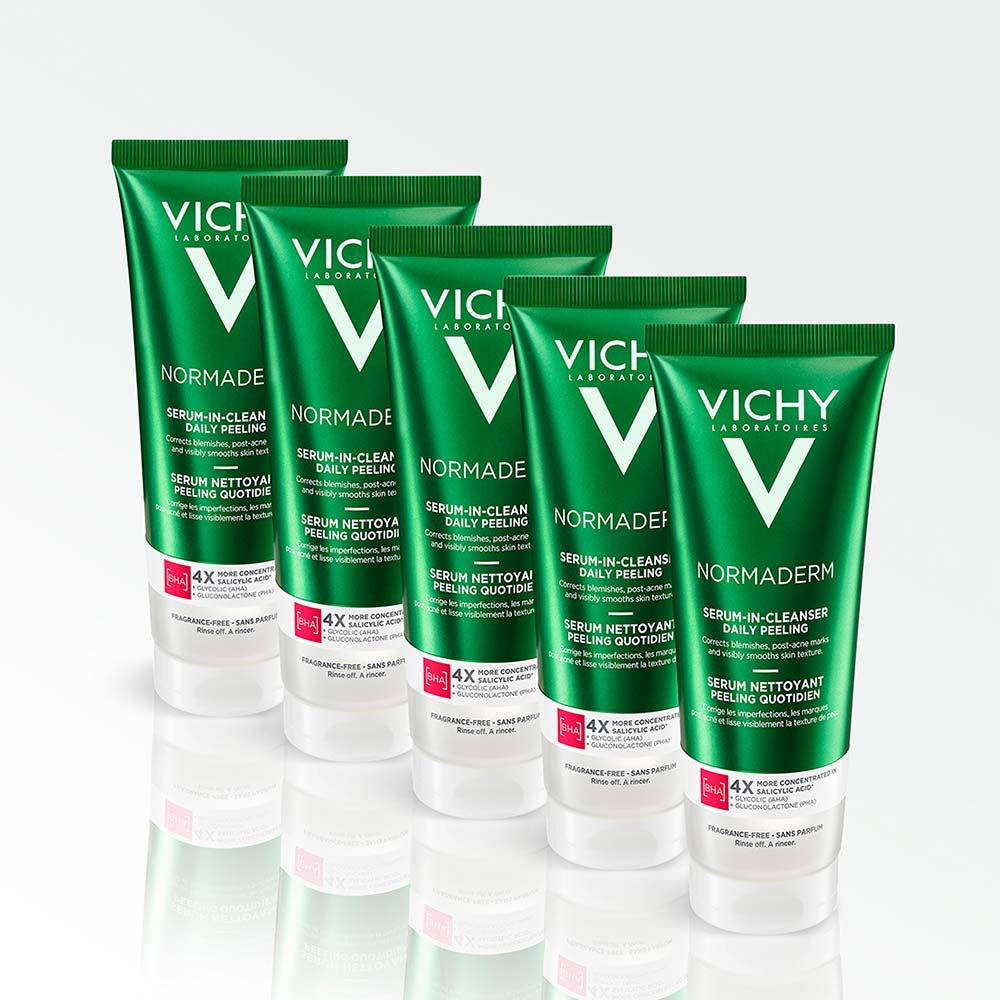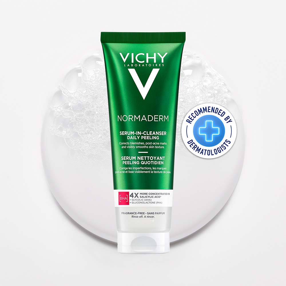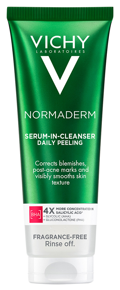 VICHY NORMADERM tisztító szérum mindennapos hámlasztásra segít korrigálni a bőrhibákat, az akné után megmaradó foltokat és láthatóan simítja a bőrtextúrát.
