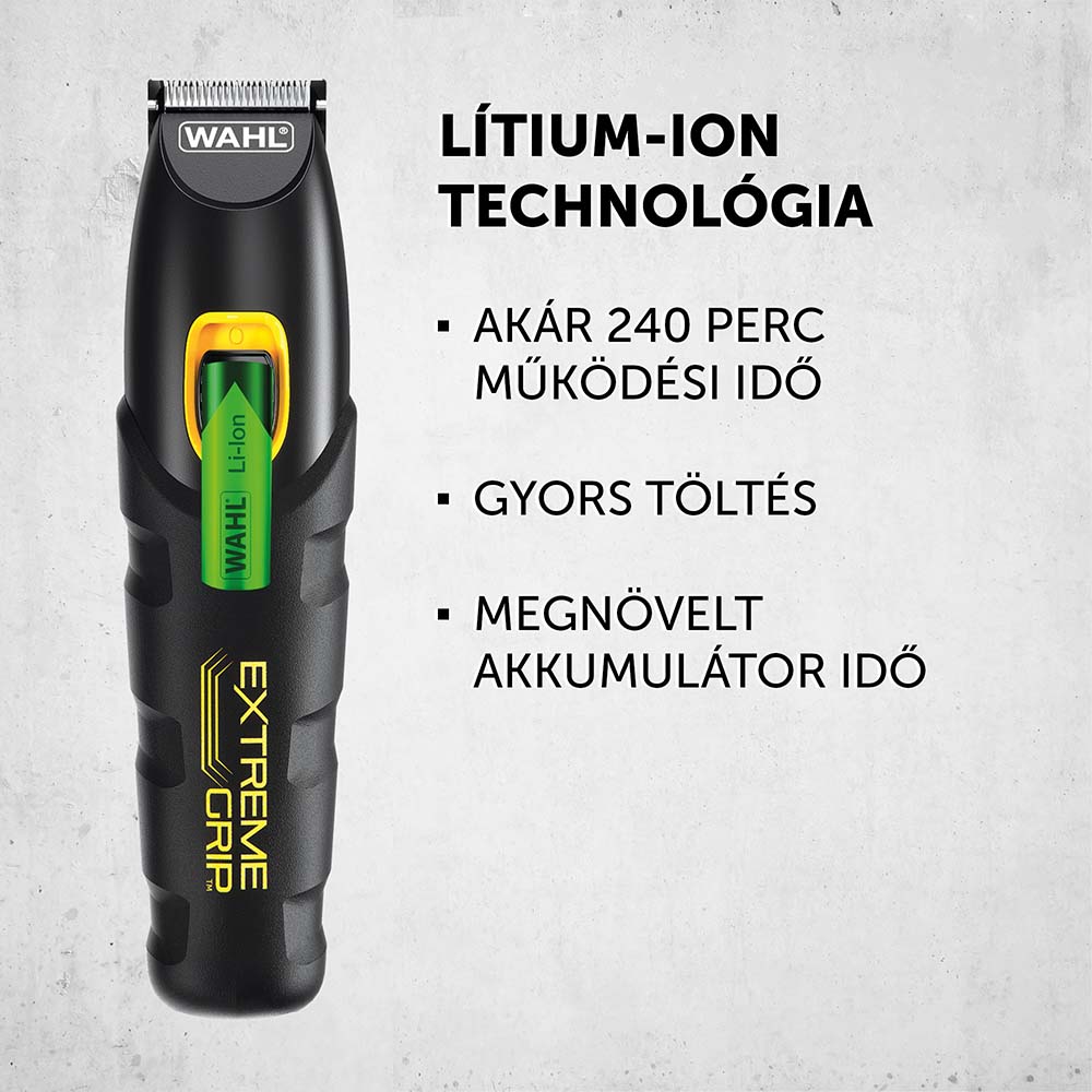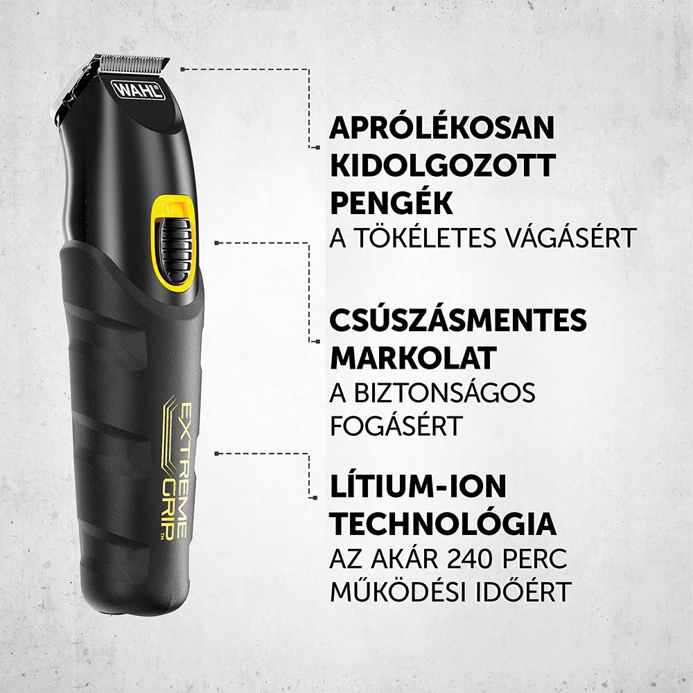 A Wahl Extreme Grip Advanced egy mindent az egyben arc- és testápoló készlet, amely biztonságos markolattal és ergonomikus, strapabíró szilikonházzal, valamit magas minőségű nyírófejekkell rendelkezik. Nagy teljesítményű motor, erős Lítium-ion akkumulátor és 4 többfunkciós fej gondoskodik a kiemelkedő teljesítményért és a teljes testápolásért.